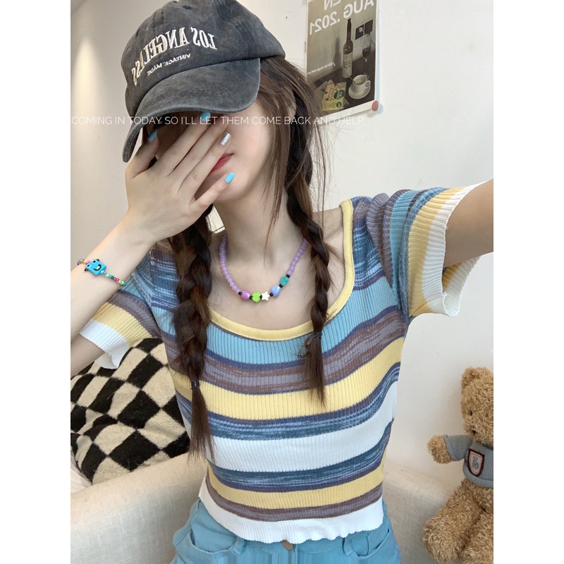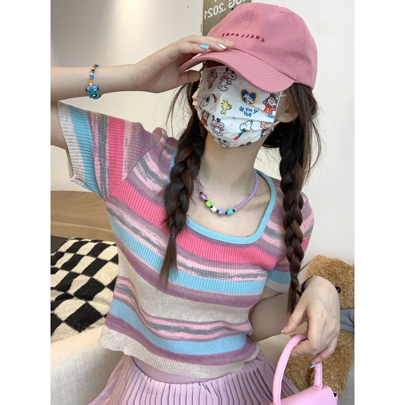 Red Rainbow bergaris lengan pendek rajutan sweater wanita musim panas 2023 baru manis dan pedas gaya chic kerah persegi slim pendek top pasang