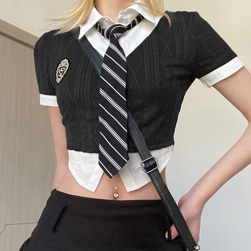 Detail Red Rapcopter gaya perguruan tinggi Amerika rajutan T-shirt wanita dua potong palsu warna hit POLO + dasi atasan ramping manis dan pedas