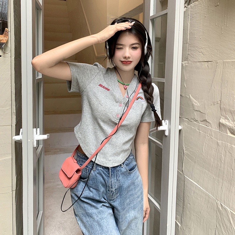 Detail Red Rasa Desain V-Leher Lengan Pendek Bahu T-shirt Wanita Musim Panas 2023 Baru Chic Manis dan Pedas Niche Pendek Irregular Top