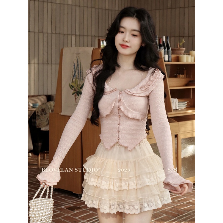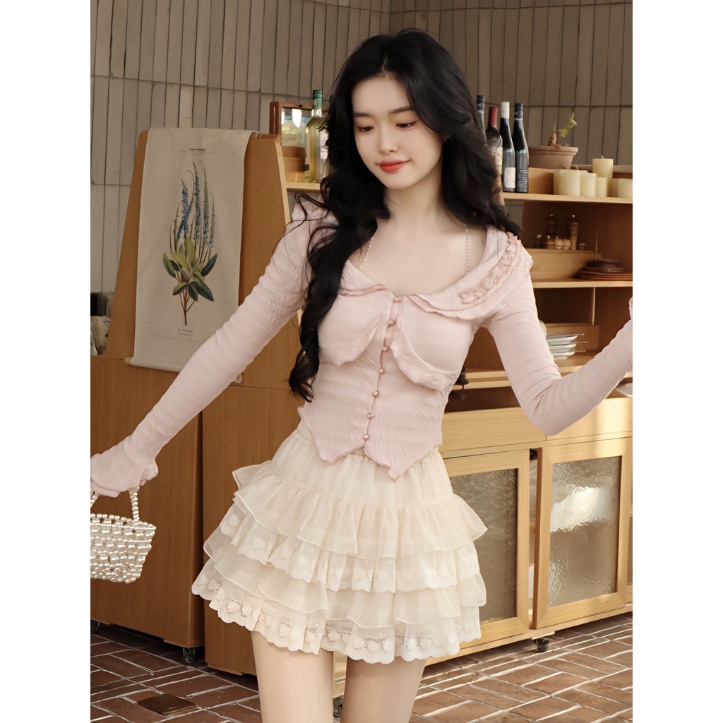 Pakaian Wanita > Batik > Set Wanita Batik > Red Raspberry Milkshake Gaya Balet Jamur Top T-Shirt Musim Semi Renda Industri Berat Kue Setelan Rok Wanita
