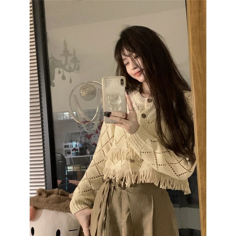 Red Retro Fashion Fringed Cardigan Wanita Trendi Aprikot Rajutan Jaket Jaket Awal Musim Gugur Baru Murni Keinginan Temperamen Lembut Sweater