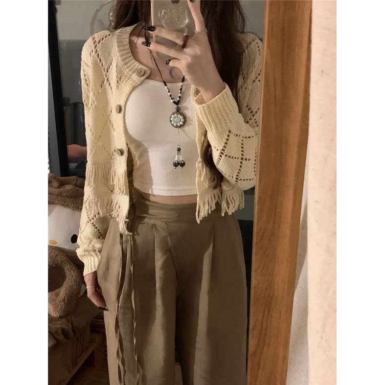 Pakaian Wanita > Batik > Atasan Batik > Red Retro Fashion Fringed Cardigan Wanita Trendi Aprikot Rajutan Jaket Jaket Awal Musim Gugur Baru Murni Keinginan Temperamen Lembut Sweater