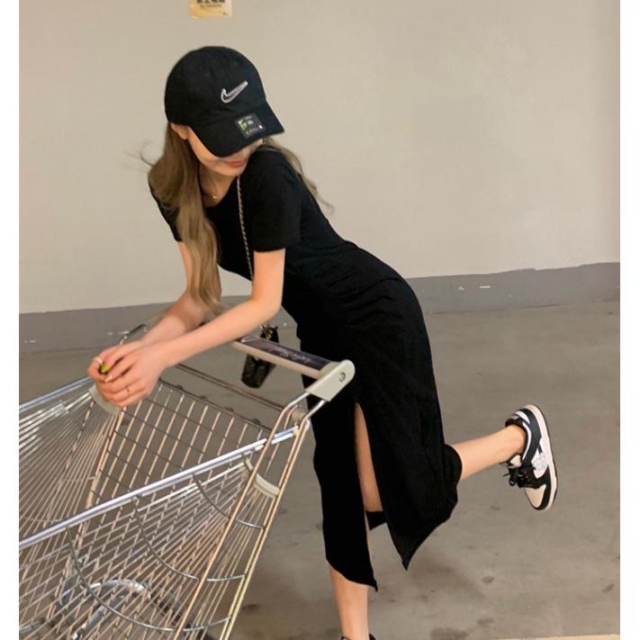 Pakaian Wanita > Batik > Dress Batik > Red Rok belahan tidak beraturan Gaun ramping ramping musim panas wanita rasa desain ceruk hitam rok panjang sedang rok over-the-knee