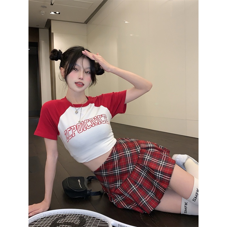Red Rok kotak-kotak merah manis dan pedas wanita musim panas Amerika retro A-line rok lipit rok pendek setelan rok rapi