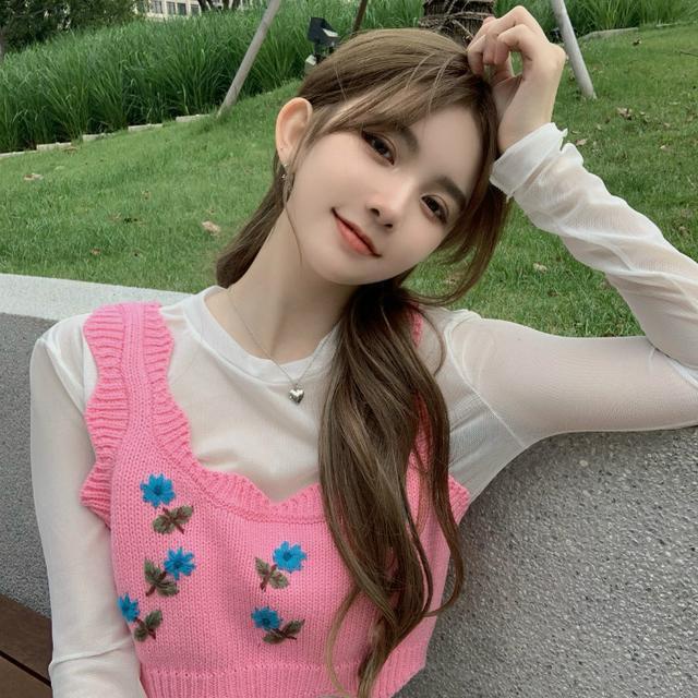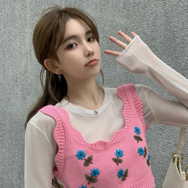 Detail Red Rompi Tipis One-Piece Suit Longgar Pendek Bordir Rajut Tanpa Lengan Rompi Jepang Kecil Rompi Rompi Top