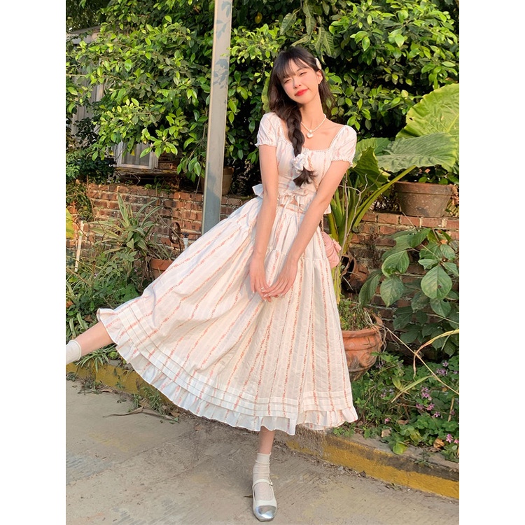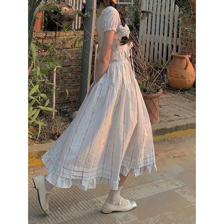 Red Rose Maiden Lace Stitching Lace Up Sweet Square Neck Short Top + A-line Skirt Two-Piece Set Musim Panas Baru