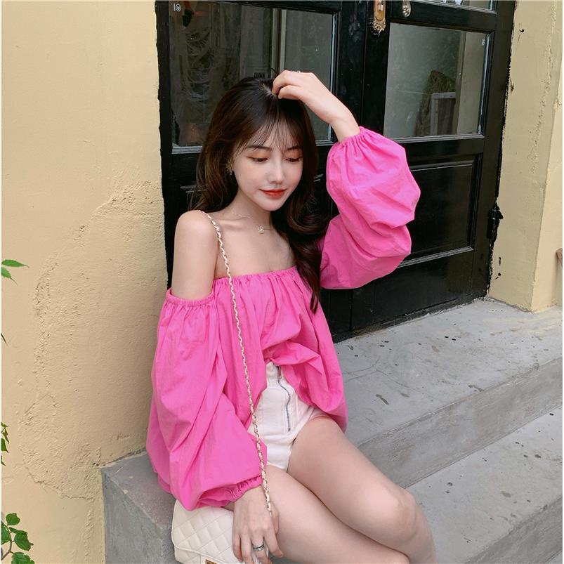 Red Seksi One-Shoulder Top Boneka Kemeja Wanita Musim Panas Baru Angin Lembut Longgar Lengan Panjang T-shirt Mawar Merah bottoming Kemeja