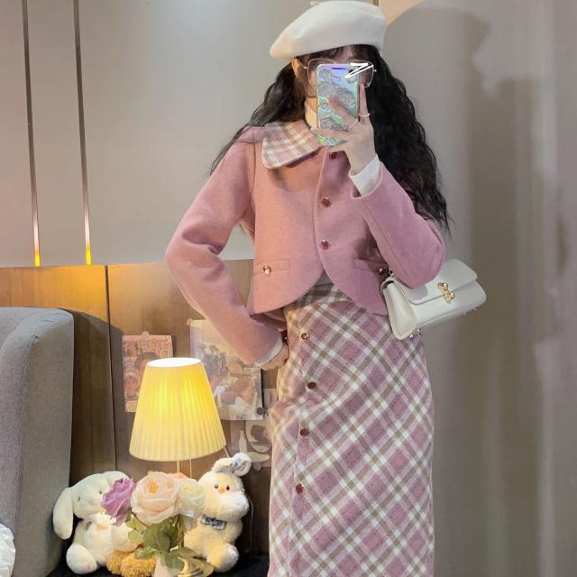 Pakaian Wanita > Batik > Set Wanita Batik > Red Setelan satu potong gadis trendi musim gugur dan musim dingin setelan temperamen selebriti retro setelan wol setelan gaya asing merah muda set dua potong