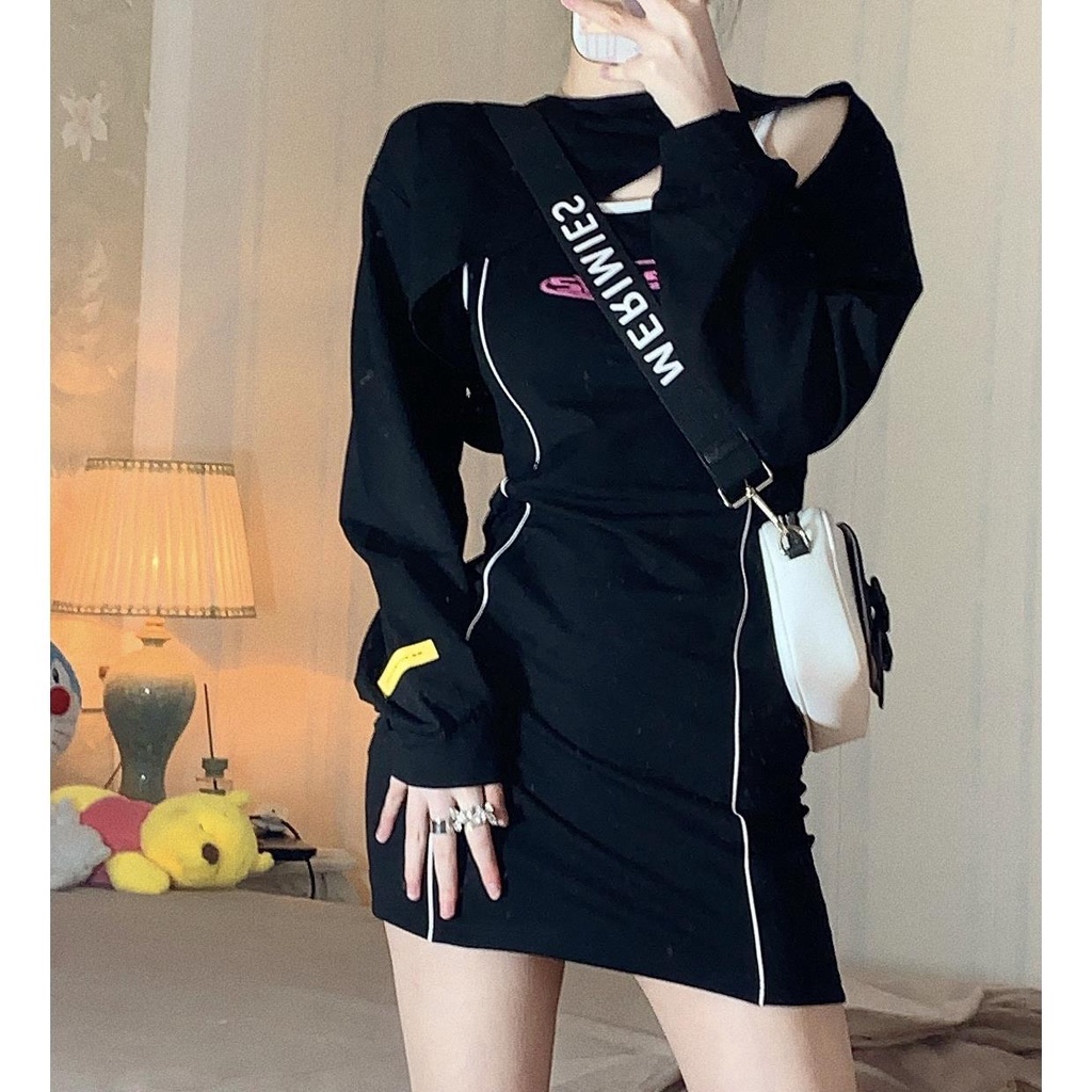 Pakaian Wanita > Batik > Set Wanita Batik > Red Single/Dua-Piece Suit Gadis Panas Alfabet Cetak Slim Suspender Hitam Gaun + Tipis Perlindungan Matahari Pakaian Di Atas Kemeja