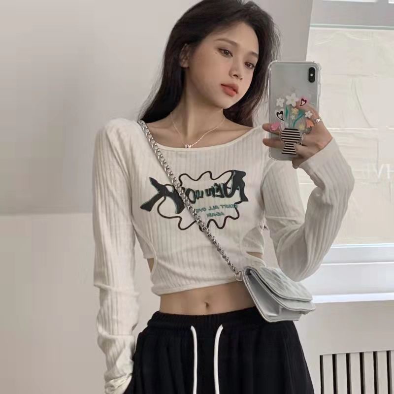 Detail Red Slim fit dan blus rajutan ramping dengan selera desain Hollow out waist all-match print T-shirt pendek lengan panjang hot girl top