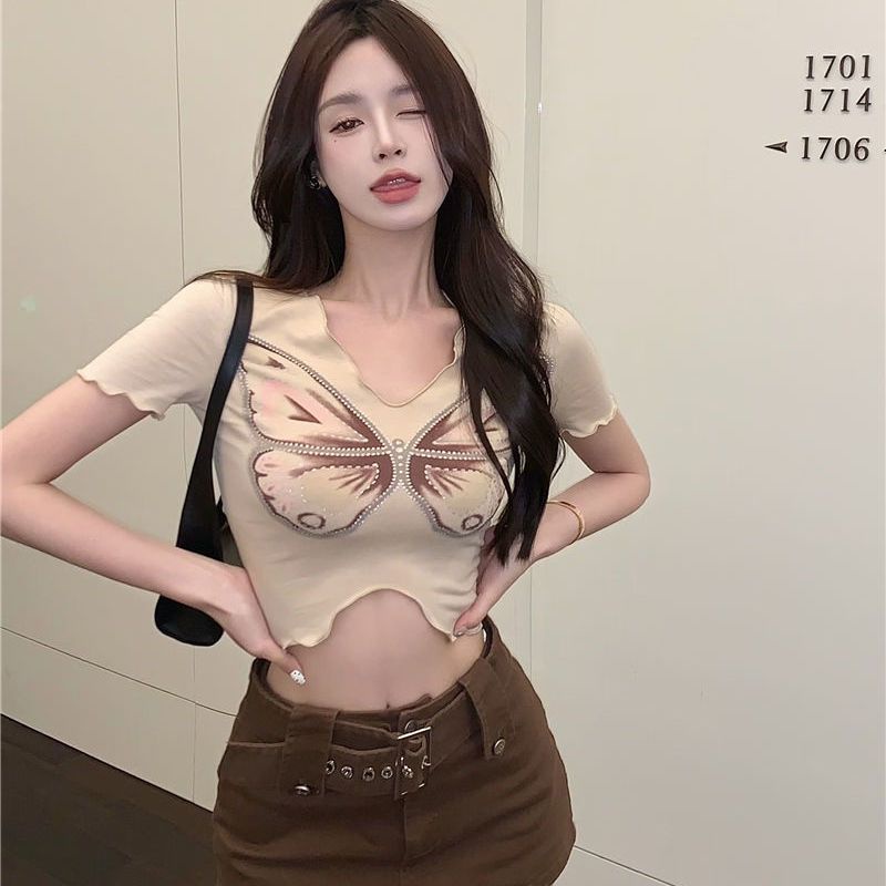 Detail Red Slim fit tipis lengan pendek T-shirt wanita musim panas 2022 murni keinginan tren hot girl kupu-kupu cetak v-neck crop top
