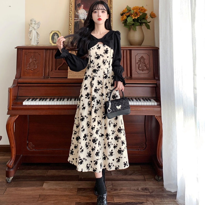 Red Sling Gaun Wanita 2023 Musim Semi Pakaian Ikatan Simpul Lengan Panjang Selendang Sling Bunga Rok Dua Potong Set