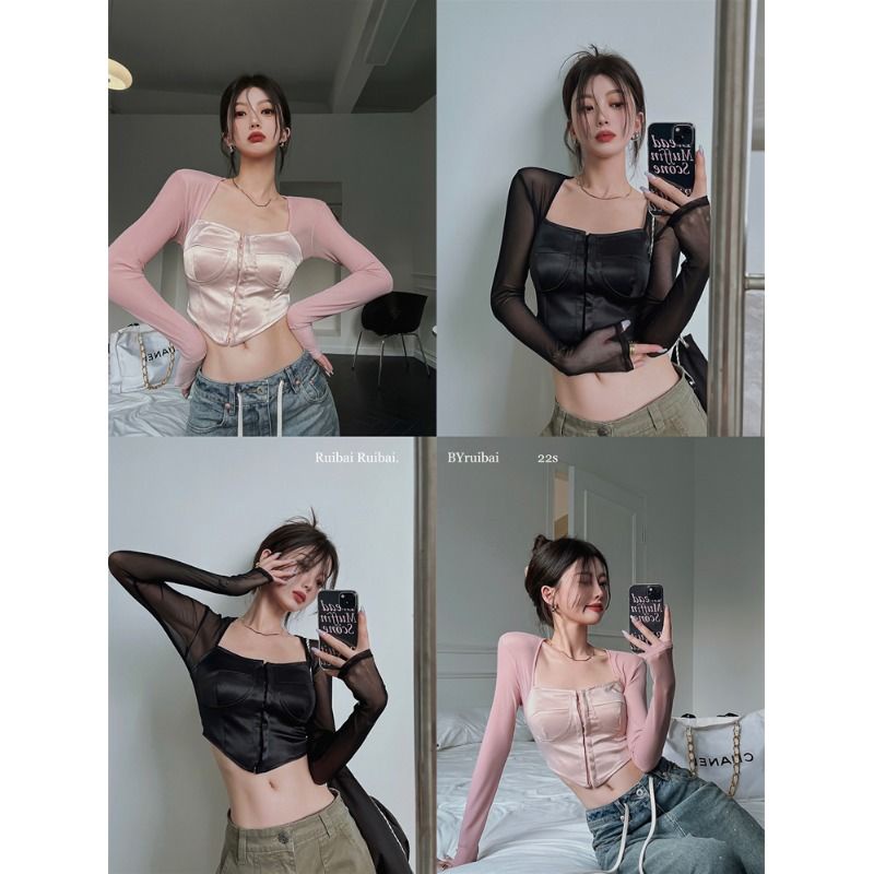 Detail Red Spice Girl Black Square Leher Kaos Lengan Panjang Wanita Musim Panas Seksi Ketat Tidak Teratur Jahitan Chic Atasan Pendek