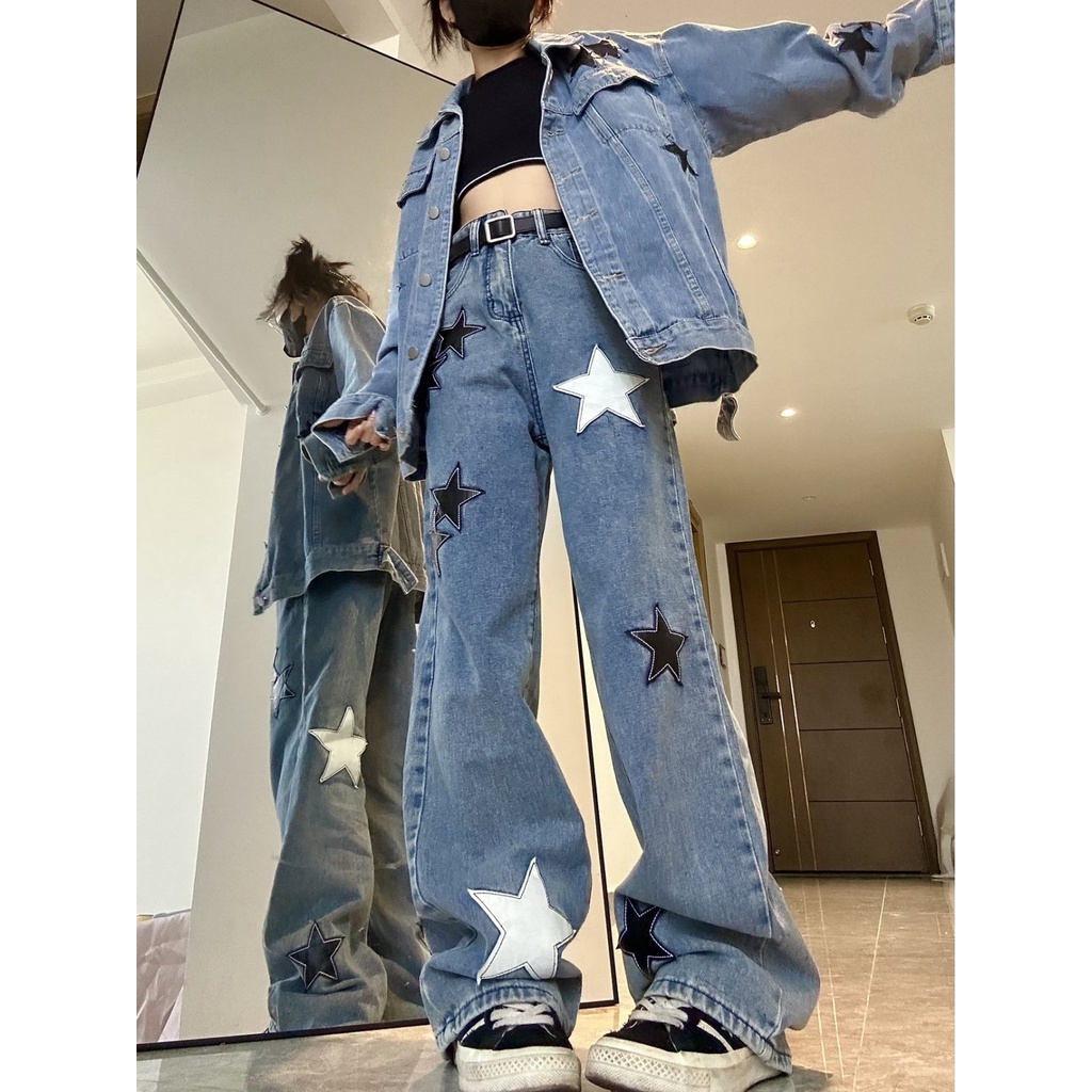 Red Star American retro vibe celana wanita Eropa dan Amerika jalan tinggi jalan lebar kaki lurus celana jins merek trendi longgar musim semi dan musim gugur