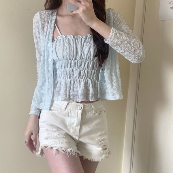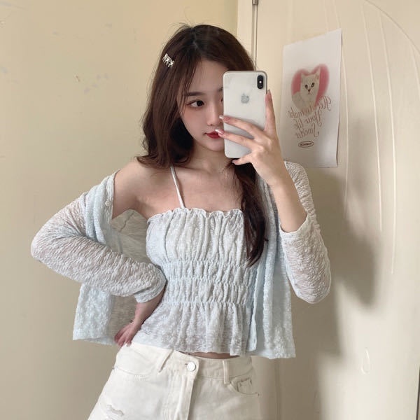 Detail Red Super peri tabir surya pakaian atas setelan manis dan pedas wanita musim panas desain keinginan murni kardigan renda kamisol set dua potong