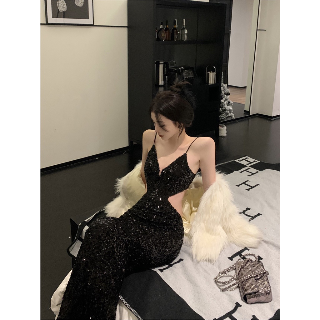 Pakaian Wanita > Batik > Dress Batik > Red Suspender payet hitam gaun wanita musim semi rasa desain rok gaun hitam buka kembali seksi temperamen tas pinggul rok panjang