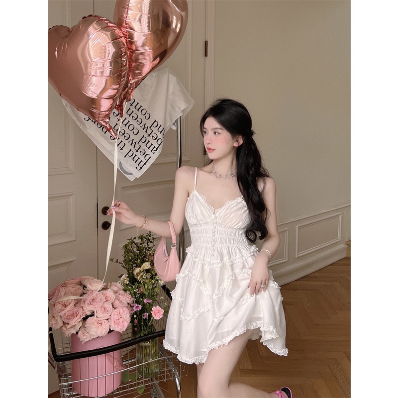 Red Suspender putih gaun wanita musim panas keinginan murni indah kembali busur cinta pertama rok fashion pinggang ramping rok a-line