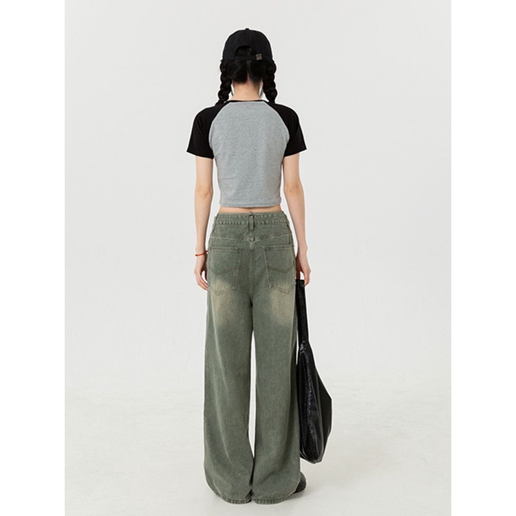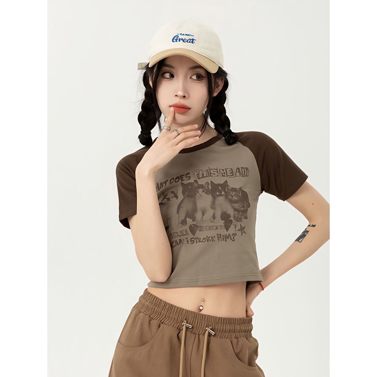Red T-shirt katun lengan pendek jahitan retro Amerika warna hit musim panas baru manis dan pedas kemeja hot girl crop top pendek
