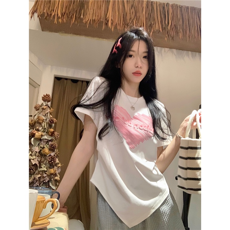 Detail Red T-shirt lengan pendek gaya Hong Kong leher bulat wanita musim panas baru semua pertandingan desain huruf bordir merek trendi atasan longgar dan tipis