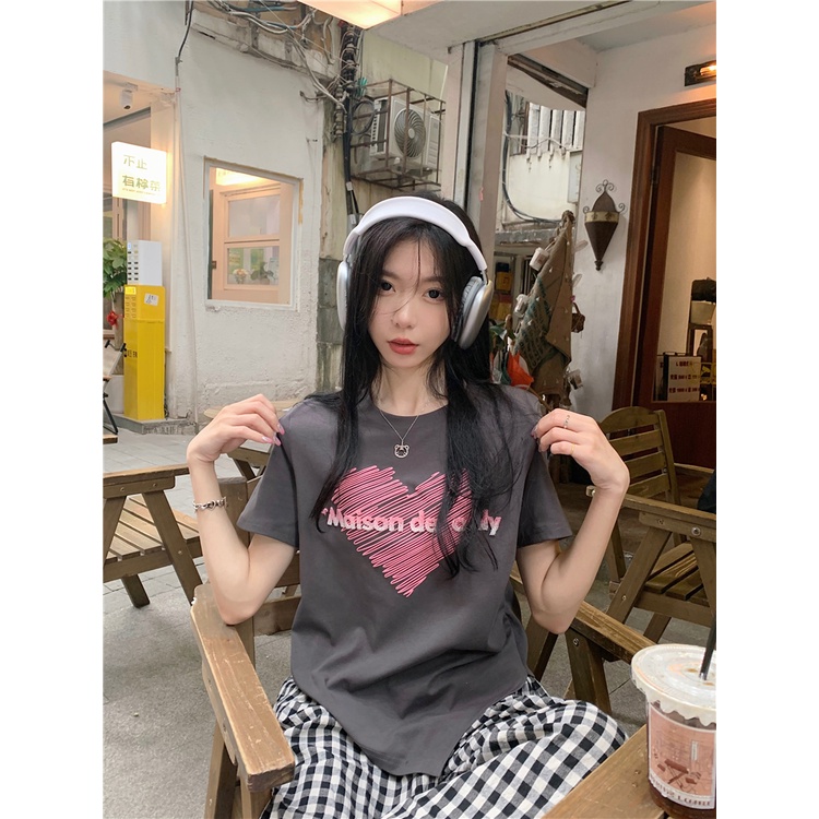 Red T-shirt lengan pendek gaya Hong Kong leher bulat wanita musim panas baru semua pertandingan desain huruf bordir merek trendi atasan longgar dan tipis