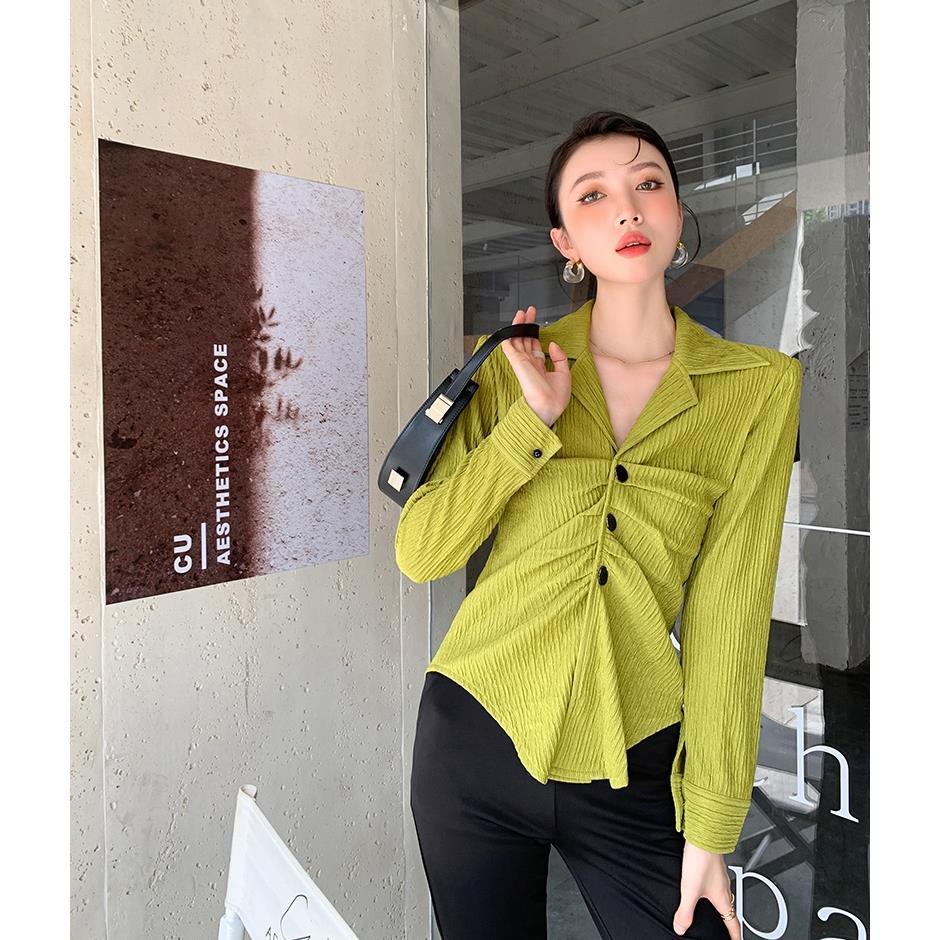 Pakaian Wanita > Batik > Atasan Batik > Red Tekstur retro berlipat kemeja hijau mustard longgar Gaya desain Hong Kong rasa kerah V-neck 2021 awal musim gugur top baru