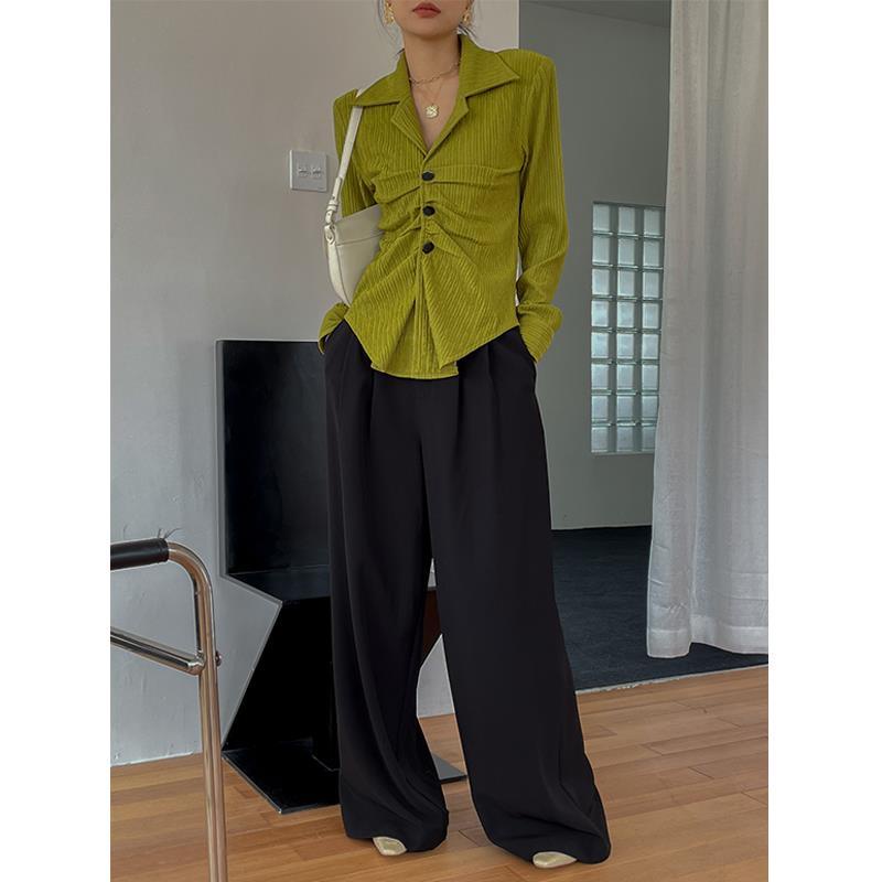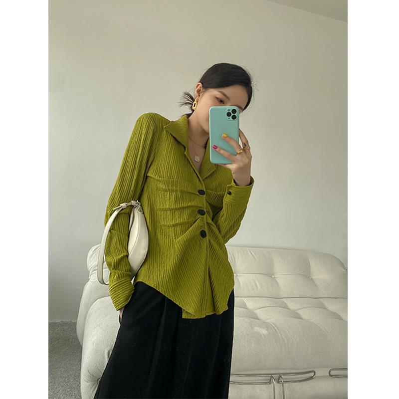 Pakaian Wanita > Batik > Atasan Batik > Red Tekstur retro berlipat kemeja hijau mustard longgar Gaya desain Hong Kong rasa kerah V-neck 2021 awal musim gugur top baru