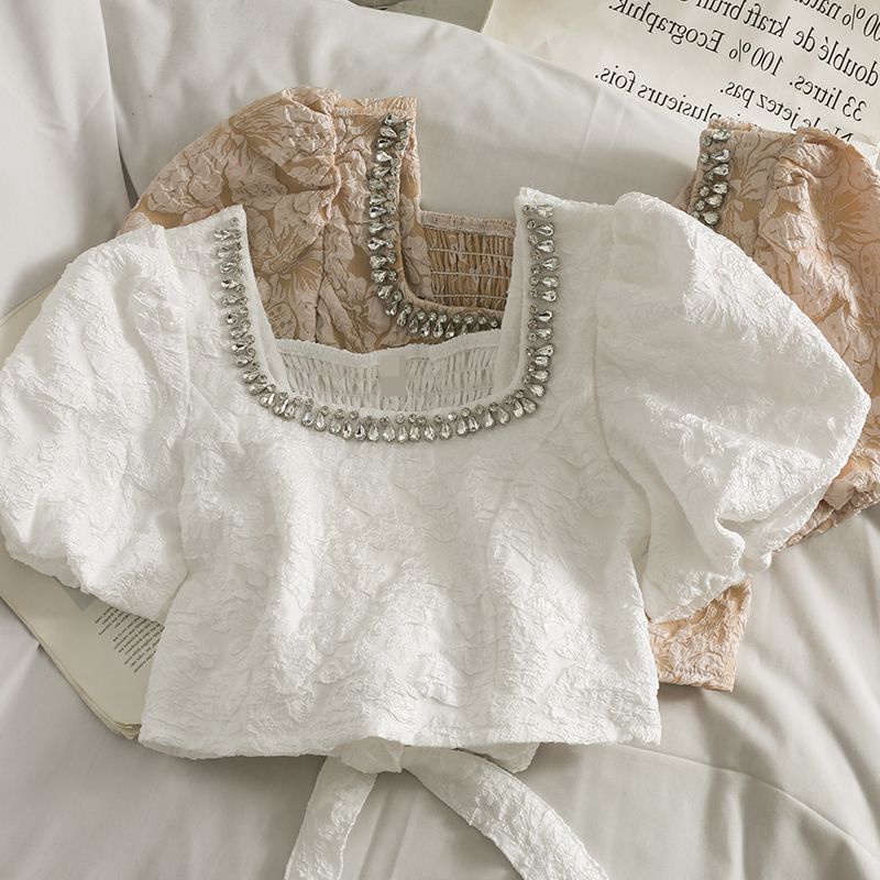 Detail Red Toko diskon merek lini pertama memotong standar kerah persegi tulang selangka pendek kemeja kecil wanita dasi kupu-kupu puff lengan atas