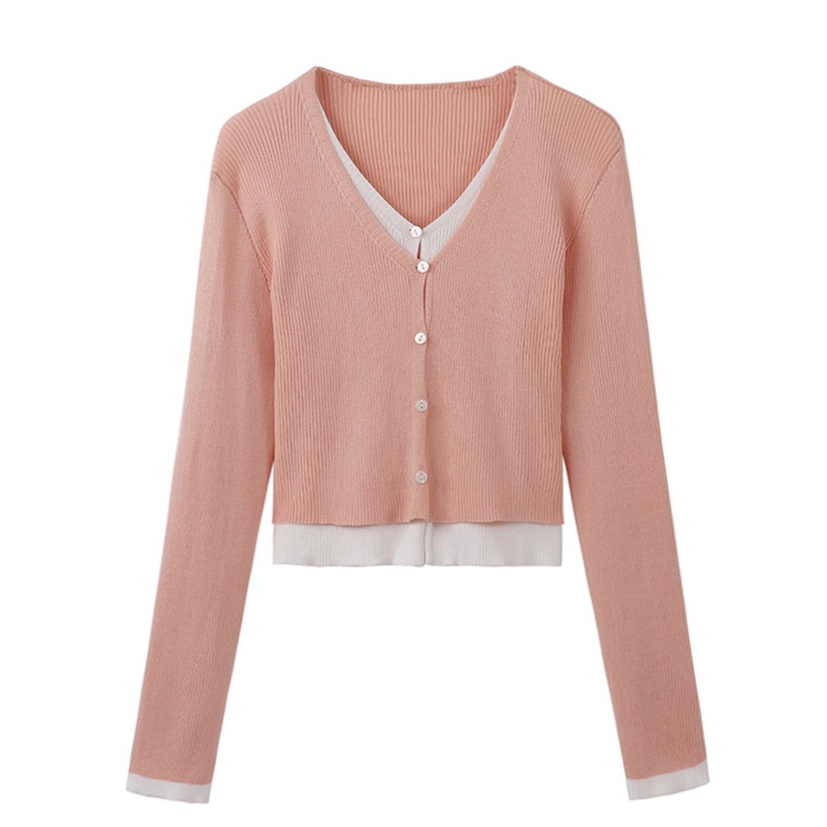 Pakaian Wanita > Batik > Atasan Batik > Red V-Leher Palsu Dua Potong Rajutan Cardigan Jaket Wanita Musim Semi dan Musim Gugur Longgar Abu-abu Kemeja Pendek Lengan Panjang bagian Dalam Atas