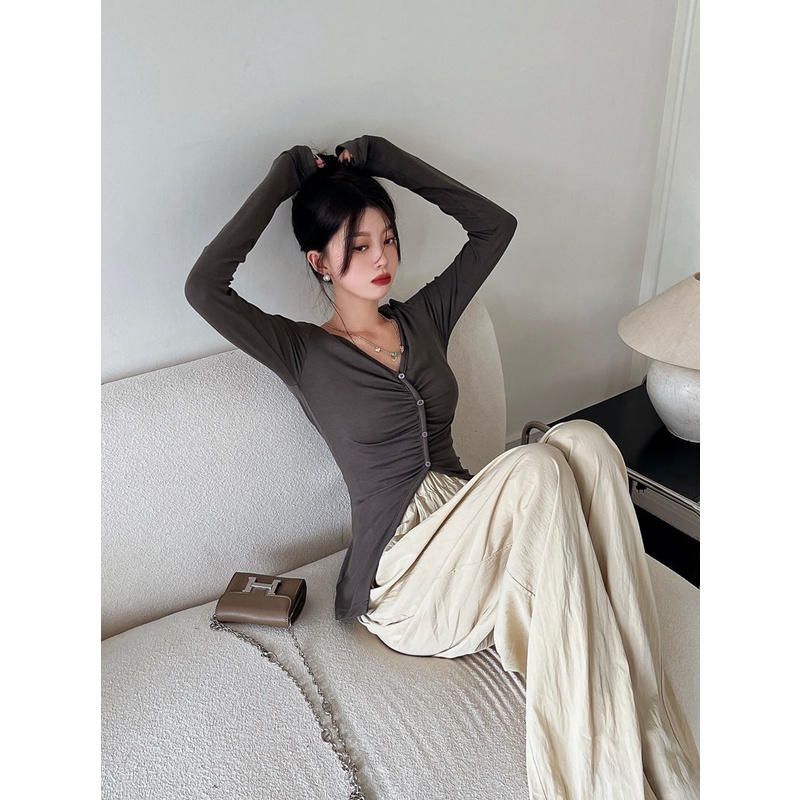 Detail Red V-neck ramping lengan panjang t-shirt wanita atasan ramping baru musim gugur