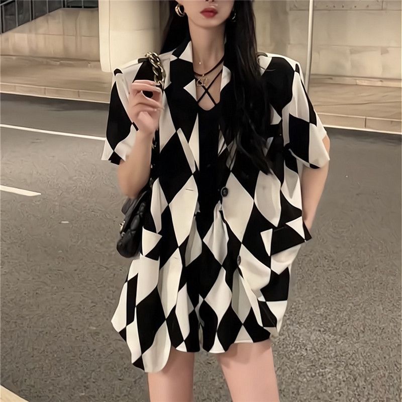Detail Red Versi korea dari setelan kotak-kotak hitam dan putih kasual all-match musim panas bagian tipis adalah belah ketupat tipis kotak-kotak sesuai dengan kemeja lebar kaki setelan celana wanita