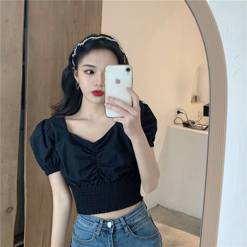 Pakaian Wanita > Batik > Atasan Batik > Red Versi Korea Retro Temperamen Kerah Persegi Puff Lengan Kemeja Wanita Musim Panas 2021 Baru Slim Fit All-Match kemeja Pendek Top