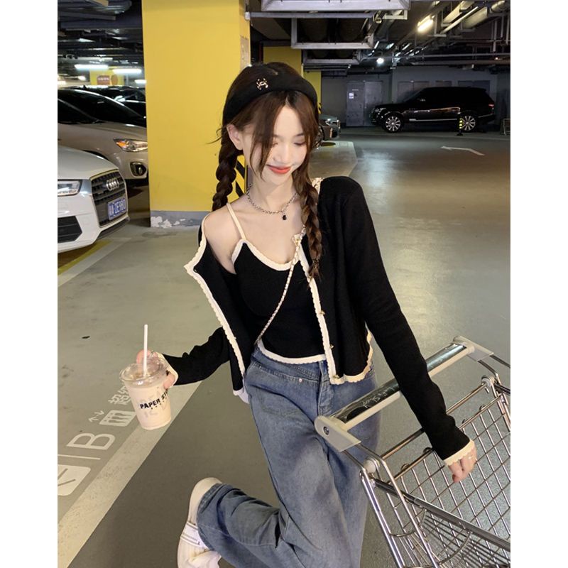 Pakaian Wanita > Batik > Atasan Batik > Red Warna kontras pendek manis dan pedas kardigan tabir surya lengan panjang + kamisol dalam wanita musim gugur 2022 setelan mode baru