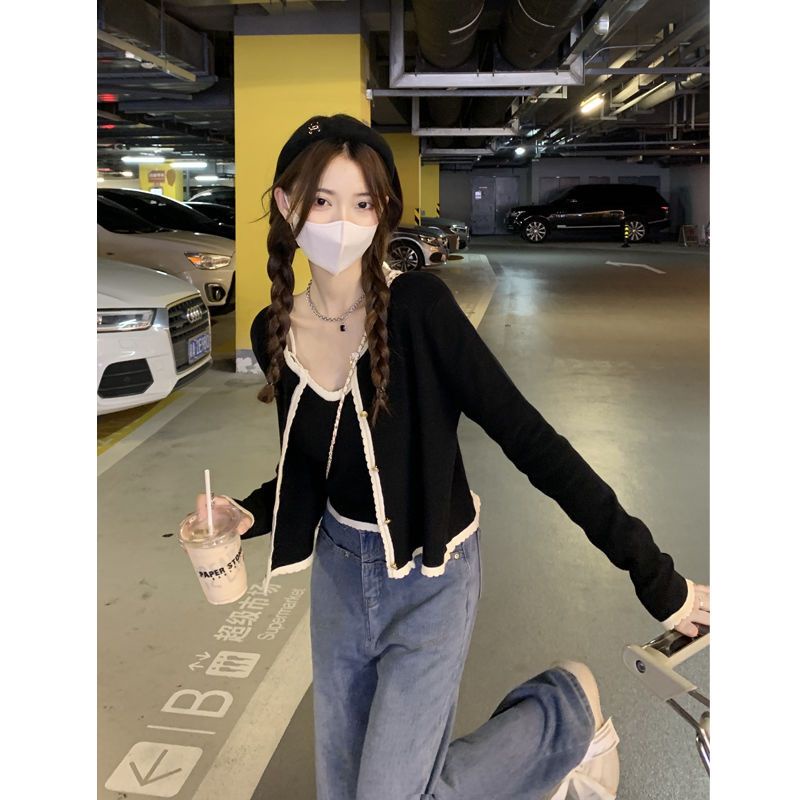 Detail Red Warna kontras pendek manis dan pedas kardigan tabir surya lengan panjang + kamisol dalam wanita musim gugur 2022 setelan mode baru