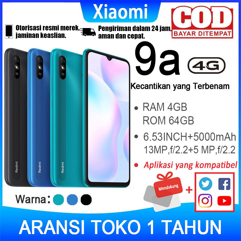 ★★★★★★★★★★★★★★★★★★★★★★★★ specification Merek:Xiaomi Model:Redmi 9a Warna: ️Carbon Gray (Midnight Black), Sky Blue (Sea Blue), Ocean Green (Nature Green) Faktor bentuk:Layar sentuh Dimensi (mm):164.9 x 77.1 x 9 mm (6.49 x 3.04 x 0.35 in) Berat (g):196 g (6.91 oz) SIM:Dual SIM (Nano-SIM, dual stand-by) Ukuran layar (inci):6.53 (~81.0% screen-to-body ratio) Rasio aspek:20:9 ratio (~269 ppi density) Resolusi:720 x 1600 pixels Kapasitas baterai (mAh):5000mAh Layar sentuh:Ya Prosesor:Octa-core (4x2.0 GHz Cortex-A53 & 4x1.5 GHz Cortex-A53) Prosesor membuat:MediaTek MT6762G Helio G25 (12 nm) RAM:4GB ROM:64GB Penyimpanan yang dapat diperluas:Ya Jenis penyimpanan yang dapat diperluas:MicroSDXC (dedicated slot) Penyimpanan yang dapat diperluas hingga:(1024GB) 1TB
