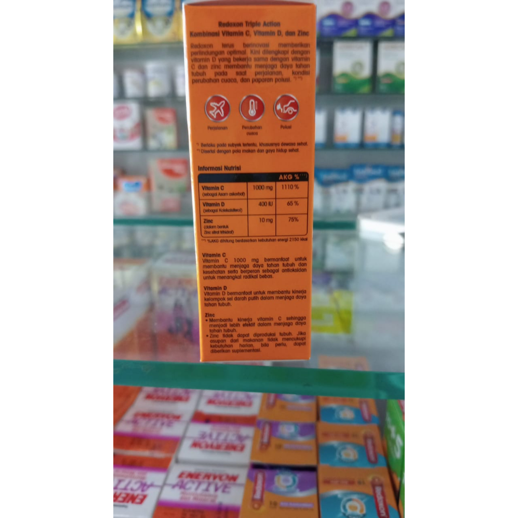 REDOXON TRIPLE ACTION EFFERVESCENT merupakan suplemen makanan yang mengandung Vitamin C dilengkapi dengan Vitamin D dan Zinc yang berfungsi untuk membantu menjaga daya tahan tubuh. Vitamin C bermanfaat membantu sistem imunitas tubuh. Vitamin D membantu menjaga fungsi daya tahan tubuh tetap normal. Zinc membantu kinerja vitamin C, sehingga menjadi lebih efektif dalam menjaga daya tahan tubuh, dan Zinc merupakan zat yang tidak diproduksi tubuh. Jika asupan dari makanan tidak mencukupi kebutuhan harian, bila perlu, dapat diberikan suplementasi.