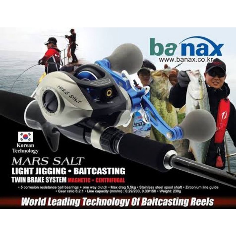 * 6 Ball Bearings For Salt Water Resistance. * Weight 230gram * Max Drag 5,5Kg. * Gear Ratio 6.2:1. * Brass Drive Gear. * Twin Brake System (Magnetic + Centrifugal). * Big Size Foam EVA Handle Knob. * 100m Double Handle Type. * Possible To Use Economic Bottom Lines. * Line Capacity (mm/m) = 0,29/200 . 0,33/150. * Line Capacity (PE/m) = 1,5/200.
