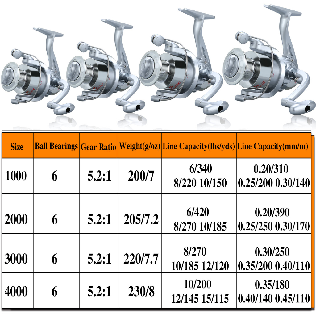 Tipe: Gulungan Memancing Berputar Warna: Perak / Hitam Ukuran: 1000-4000 Rasio Roda Gigi: 5.2: 1 Seret Maksimum: 15kg Berat: 200g / 205g / 220g / 230g
