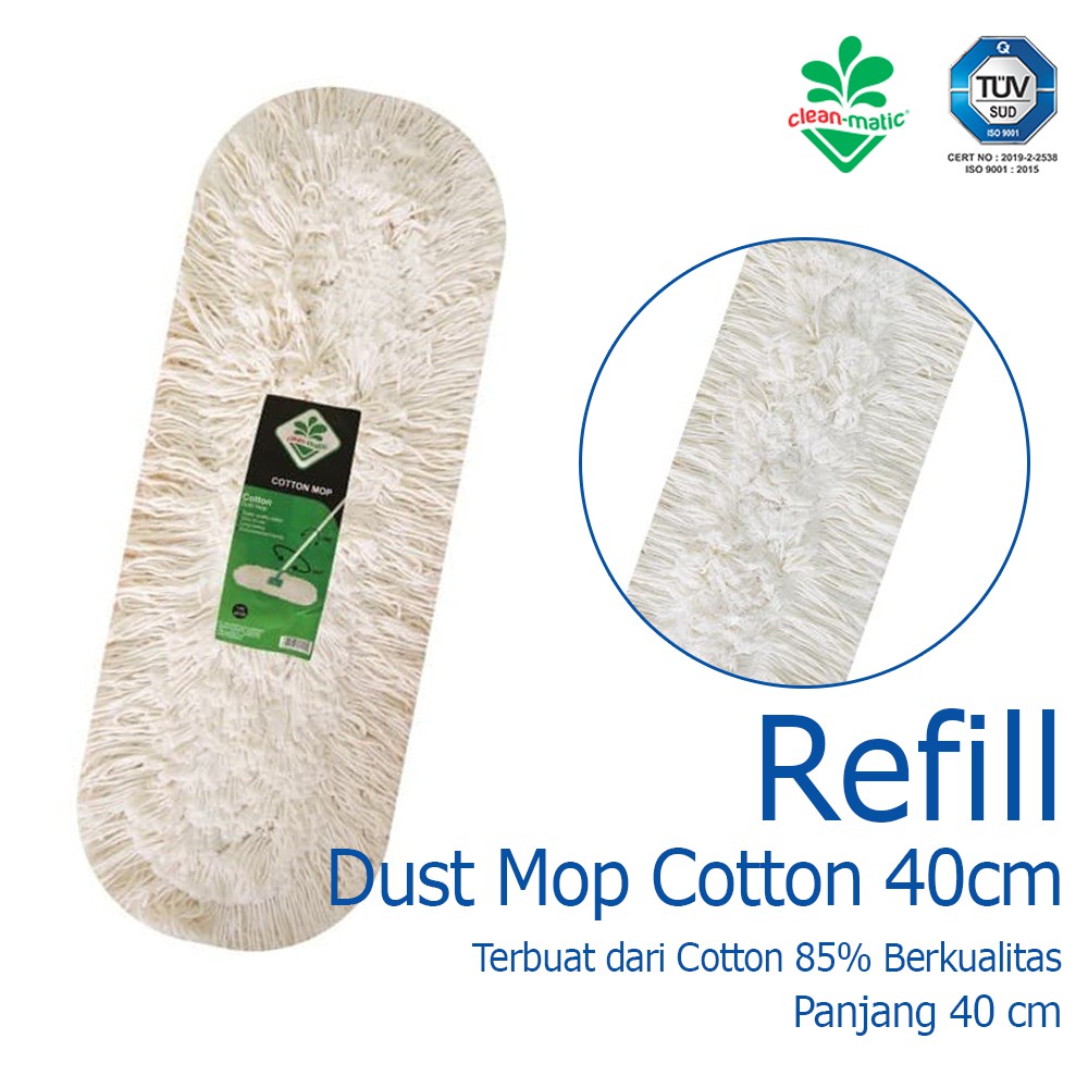 Isi Ulang Pel Debu Kapas 40 Cm, Penghilang debu berbahan katun 85%, tipe Ujung Potong (terputus) agar debu mudah dihilangkan, dengan ukuran 40 Cm yang dapat menunjang pembelian produk utama, karena pel cenderung lebih cepat aus / susutnya dibandingkan dengan gagangnya, jadi setelah menggunakan produk utama tersedia bisa beli refill saja.