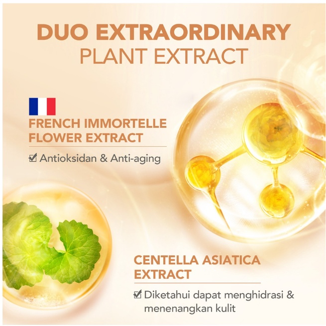 Formula mengandung ekstrak Immortelle Flower dan Centella Asiatica yang dapat membantu menjaga elastisitas kulit dan menghidrasi kulit.