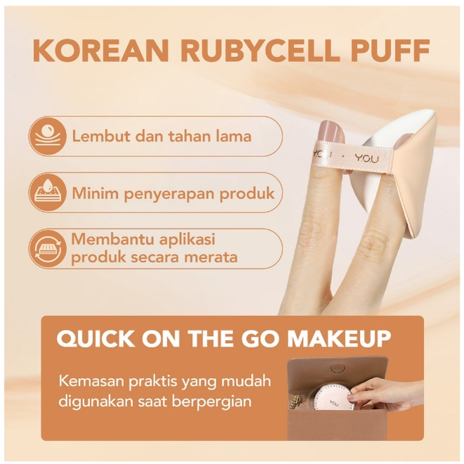 YOU NoutriWear+ Flawless Cushion Foundation mengandung Immortelle C-lock Essence & Innovative Litestay™️ technology yang membantu menutrisi kulit, lengkap dengan Korean Rubycell Puff untuk membantu aplikasi produk.