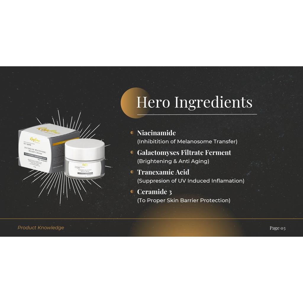 Kenapa harus ada Intensive Whitening Night Cream? - Whitening Agent (Bahan-bahan pencerah di dalam cream) dapat bekerja lebih optimal di malam hari tanpa ada sinar matahari - Kulit akan tampak lebih cerah dan noda hitam tersamarkan keesokan harinya - Formulanya membantu melindungi skin barrier dari faktor penyebab kulit kusam