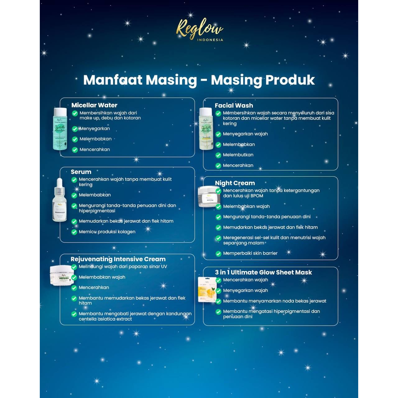 GARANSI UANG KEMBALI JIKA PRODUK BUKAN ORGINAL 100% ======= Reglow Skincare Paket Kecantikan Wajah Glowing. Glow Skin Treatment Atasi Muka Jerawat Flek Hitam Miliam Kusam. Skincare BPOM Halal MUI dan Aman untuk Bumil & Busui Cocok Segala Jenis Kulit ======= Satu set Paket Reglow Mendapatkan : Reglow Invensive Cream Reglow Toner + Micellar Water Reglow Facial Wash ======= Manfaat dari 3 varian produk Reglow treatment yang ada didalam paket Reglow