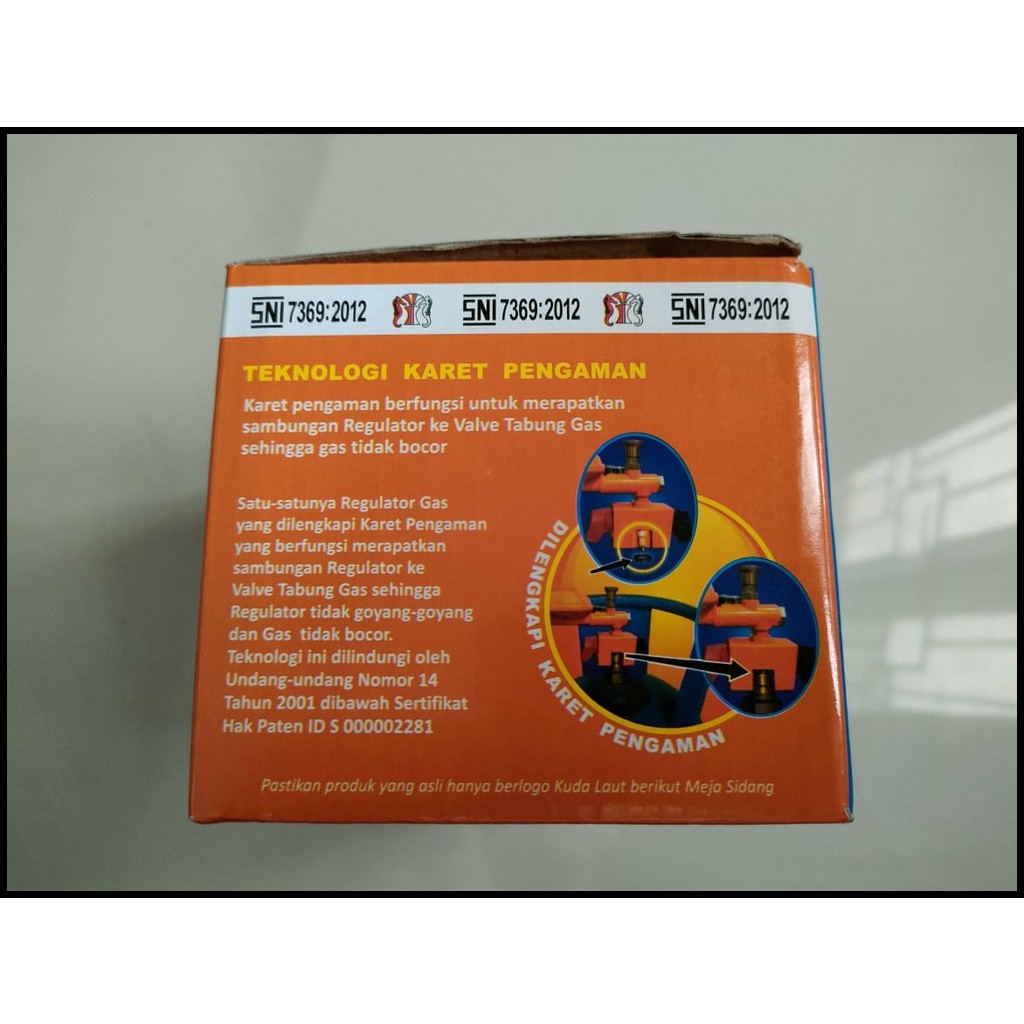 Regulator gas tekanan rendah. Anti meledak. Dengan sistem kuncian ganda (Double Lock System). Cocok untuk rumahan, tabung gas ukuran 3 Kg, 5 kg dan 12 Kg. Satu-satunya Regulator Gas yang dilengkapi dengan karet pengaman, yang berfungsi merapatkan sambungan regulator ke valve tabung gas, sehingga regulator tidak goyang-goyang dan gas anti bocor. Barang berbahan material dengan kualitas tinggi dan ber SNI. Tekanan masuk 0.7MPa. Tekanan keluar 2,8 KPa +/- 0,47 KPa Max 5 KPa.