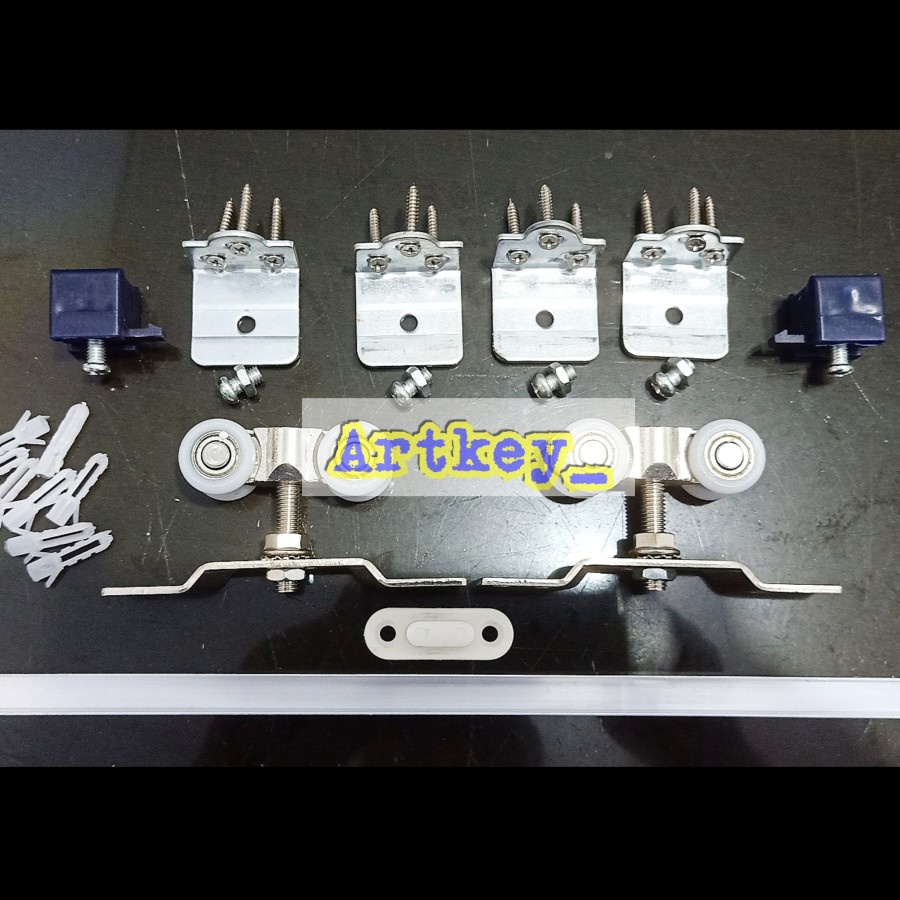 Harga perset komplit - sebatang rel atas panjng 3 meter - sepasang roda dan gait - 04 pcs breket - stoper/ baut/mur - sebatang rel u bawah panjang 150 cm
