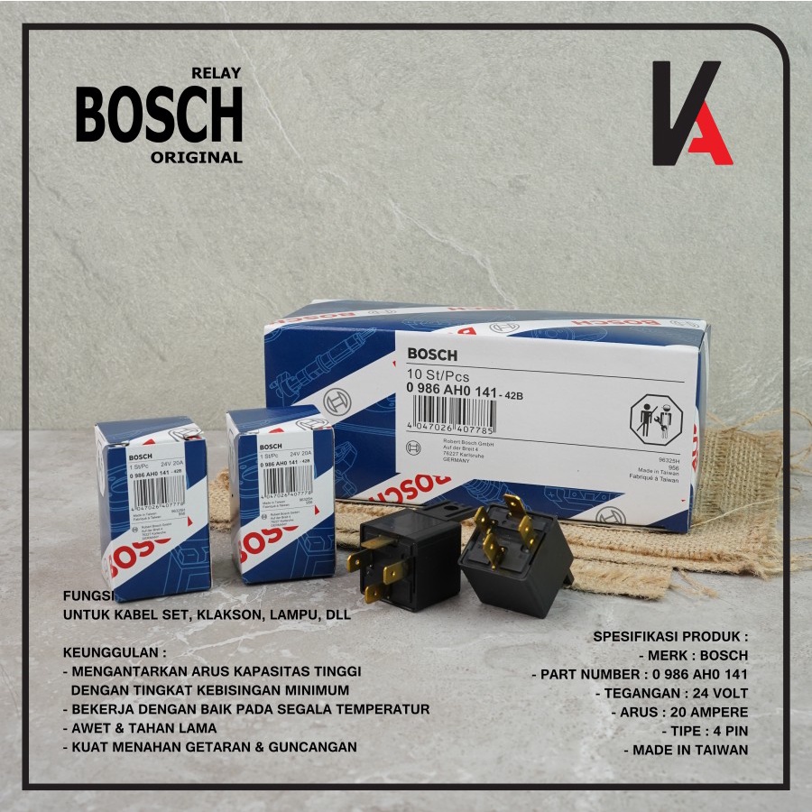 Relay Bosch 4 pin 24v umumnya banyak digunakan pada kendaraan roda empat Bus truk colt diessel. Sudah terkenal di dunia otomotif akan keawetannya dan membantu meningkatkan daya kelistrikan pada kendaraan.