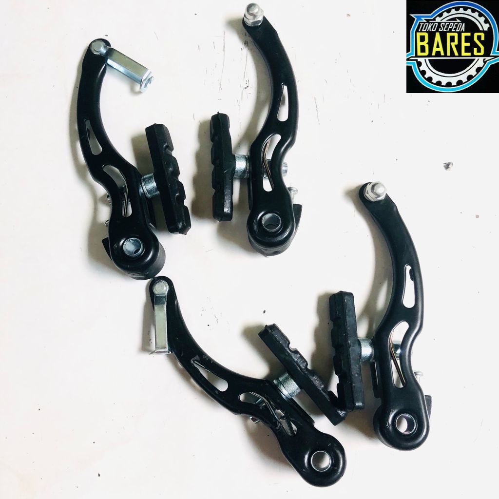 Rem V brake set sepeda depan belakang - Merk: Unicycle - Warna: Hitam - Bahan kuat dan rapi - Kelengkapan: 2 pcs handle rem bahan kombinasi alloy dan plastik, 4 pcs rem vbrake besi (Panjang arm 13 cm), 4 pcs karet rem, 2 pcs tekukan kabel rem, 2 pcs kabel rem (depan 85cm, belakang 145cm), 4 pcs baut, 2 pcs pipa karet penahan rem - Tampilan packaging random - Harga 1 set