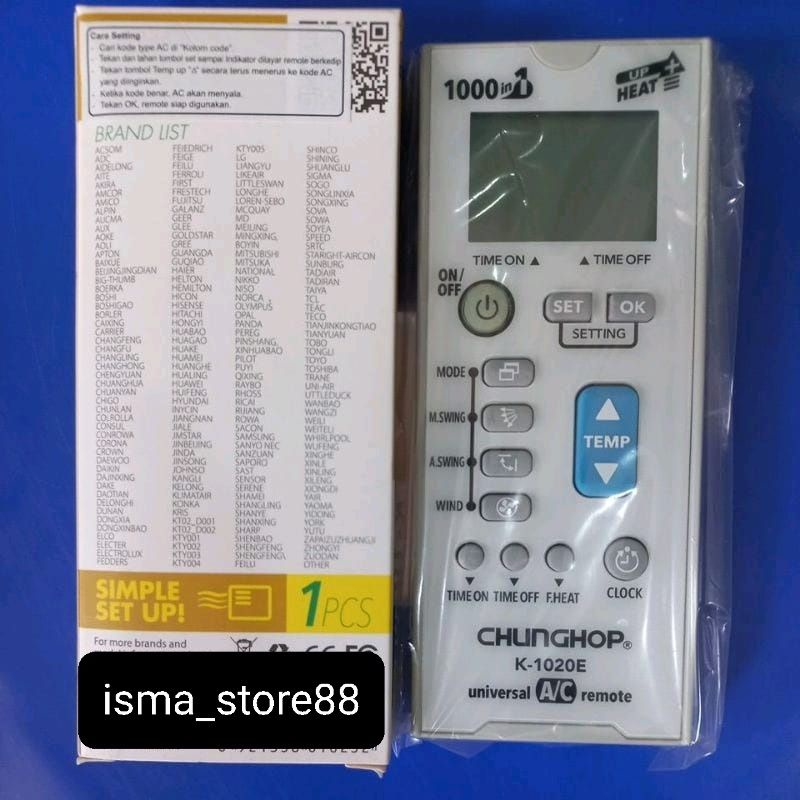 Remot ac multi 1000 in 1 chunghop k-1020e. Cocok untuk pengganti remot ac anda yang rusak/hilang. Cara pakai ada petunjuk pemakaian didalam kemasan produk ini. Barang baru dan gress Garansi toko 1minggu.