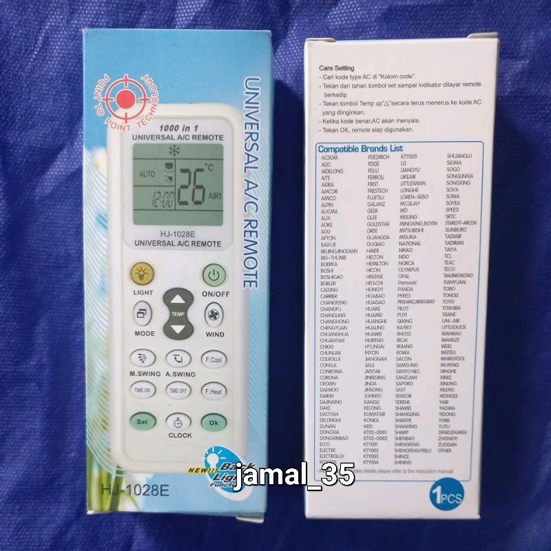 Remot ac multi/universal remot ac hampir bisa untuk semua merek ac di indonesia.produk HJ. Cara penggunaan yang sangat mudah. Ada di dalam kemasan produk (brosur). Kwalitas terbaik Menggunakan 2 buah batre A3.(harga belum termasuk batre). Untuk melihat list untuk merek bisa di lihat pada gambar no 2.