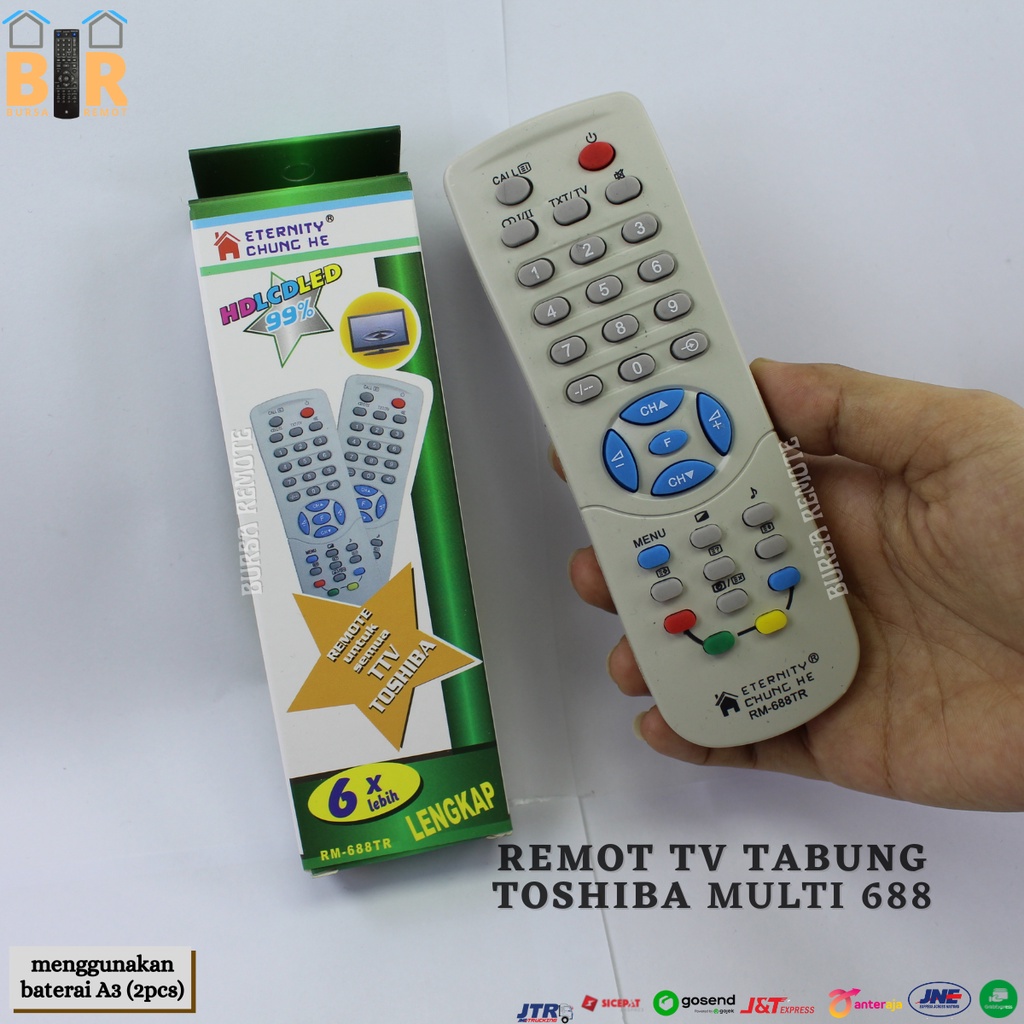 REMOTE TV MULTI TOSHIBA CHUNG HE RM - 688TR ๐ mudah digunakan ๐ bisa digunakan untuk beberapa TV Tabung merk Toshiba ๐ tombol lengkap ๐ barang dikirim sesuai gambar ๐ menggunakan baterai A3 2buah https://shopee.co.id/Baterai-dynamax-A2-dan-A3-Pcs-i.55903356.4861677484 ๐ pastikan remot yang anda pesan, sesuai dan sama persis dengan remot yang biasa anda gunakan.