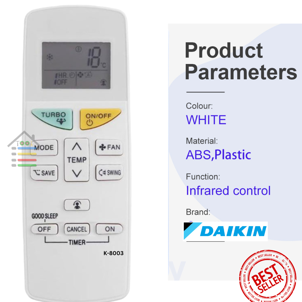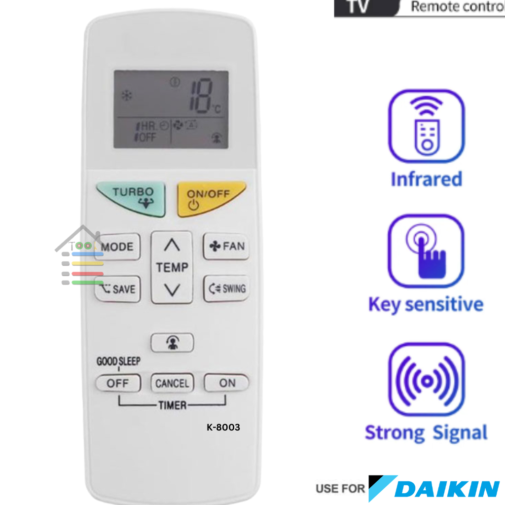 REMOTE MULTI AC DAIKIN Type K-8003TR ini bisa digunakan untuk semua AC MEREK DAIKIN. bisa langsung digunakan tanpa harus di-setting terlebih dahulu. TETAPI apabila tidak bisa digunakan anda tinggal menekan TOMBOL ON/OFF ( pastikan ac dalam keadaan menyala ) selama beberapa detik sampai ac anda terdengar bunyi '' BIP '' LALU lepaskan.